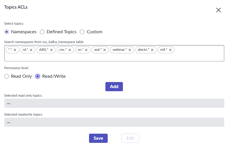 4. Once the namespaces are selected, it should look similar to the screen below
