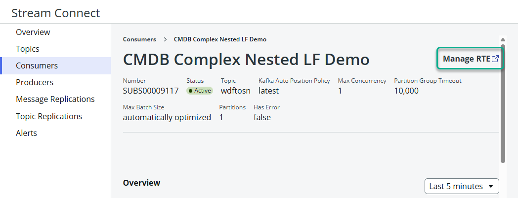 13. This will show statistics of the consumer; optionally clicking on **Manage RTE** will show the configurations created from steps 4 to 11