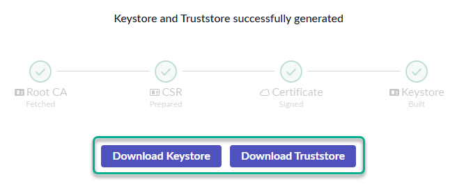 8. After a few seconds, the certificates are ready to download. Click on **Download Keystore** and **Download Truststore** to obtain the respective files