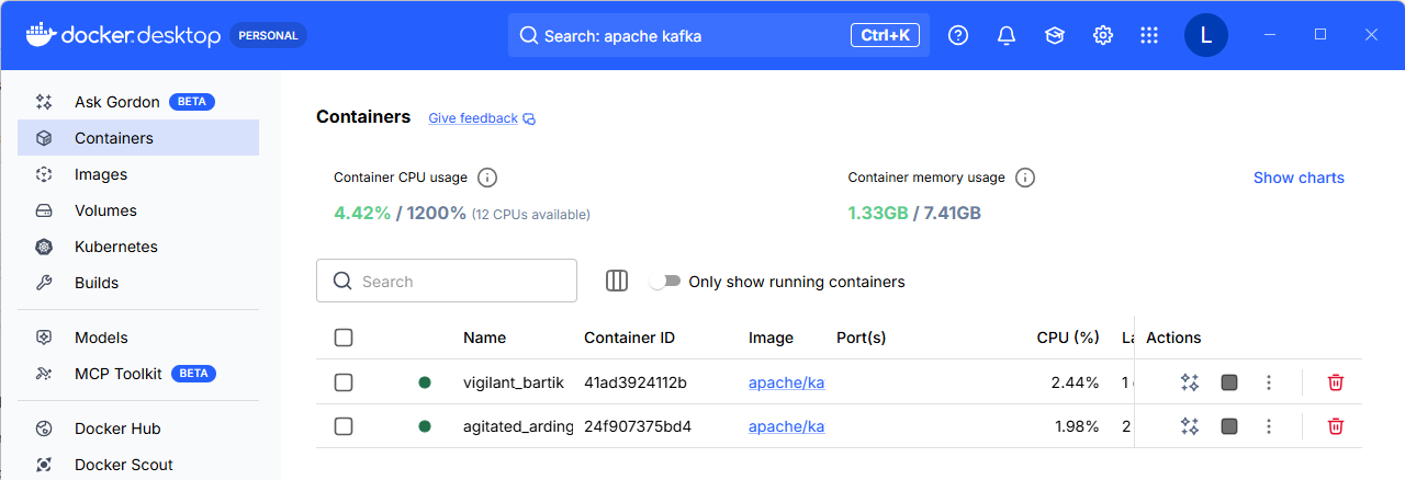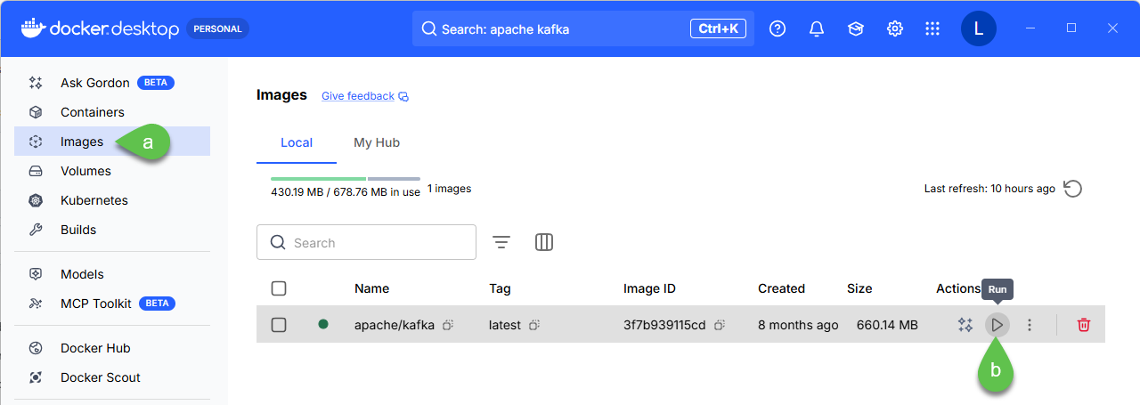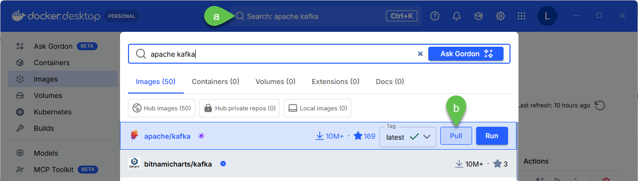 3. Open Docker, search for apache/kafka latest image by using the **Search** bar then click **Pull**