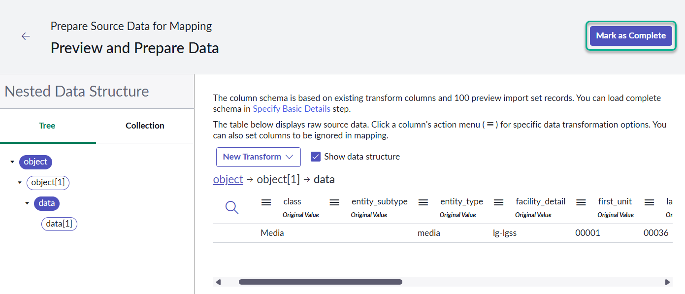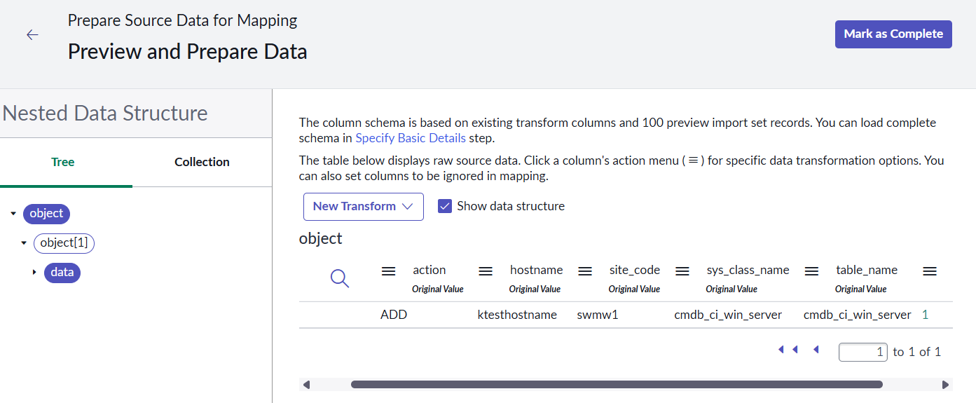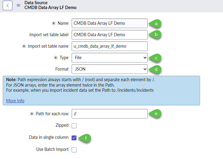 4. Create a JSON file which has the structure of the data source. Use the text below and save the file as **cmdb complex data array.json**