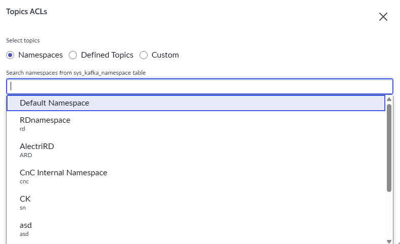 3. In the **Namespaces** section by clicking the radio button of the same name, select all of the namespaces to avoid any authorization issues. In a real environment, it is necessary to identify the correct namespace
