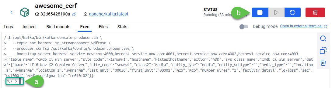 1. Continue working in the **Exec** portion of the docker image and connect to ServiceNow Stream Connect with the command below.