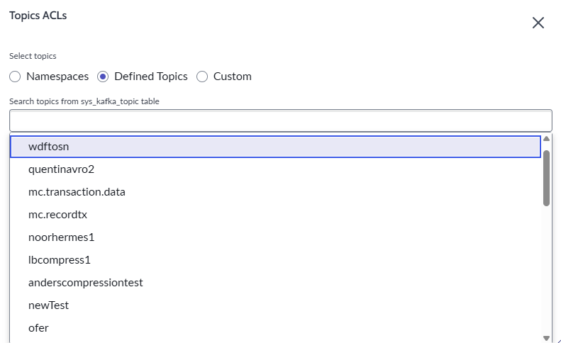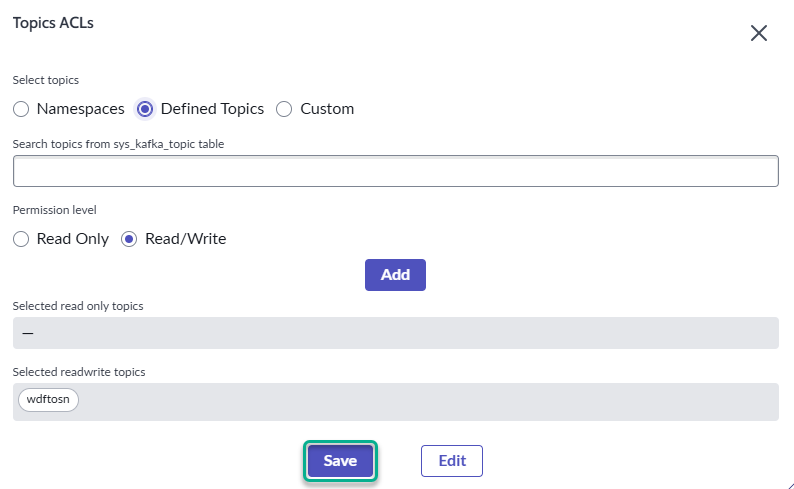 5. In the **Defined Topics** section by clicking the radio button of the same name, select **wdftosn**