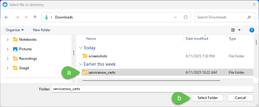 15. Navigate to the servicenow\_certs created in step 9 which contains the certificates from the ServiceNow instance then select the folder (**DO NOT** double-click)