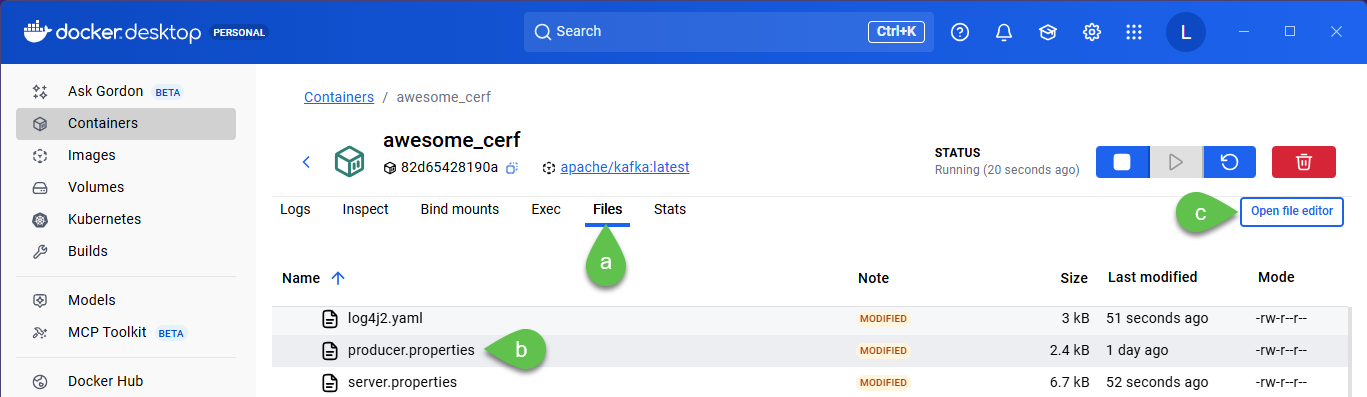 12. Go to **Files** > in the file browser navigate to the path opt > kafka > config > **producer.properties** > click **Open file editor**