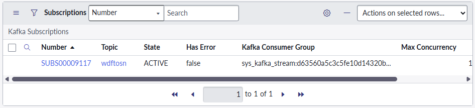9. If everything is configured correctly, the bottom of the Kafka Streams screen Subscriptions box will show an active stream with details similar to below