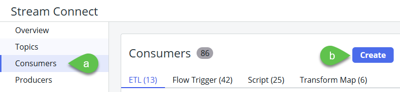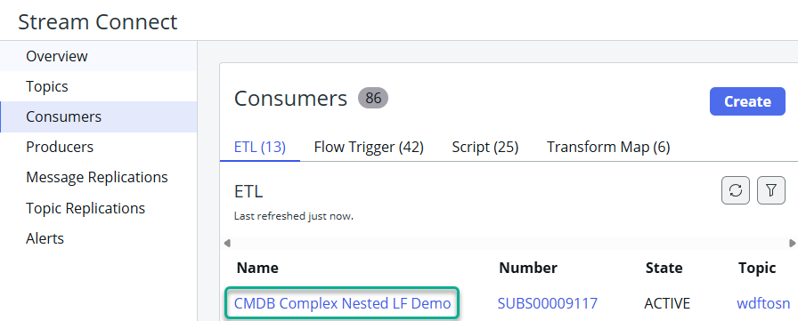 12. In the **Stream Connect** screen > **Consumers** section, the ETL created will show as active. Click on the consumer name
