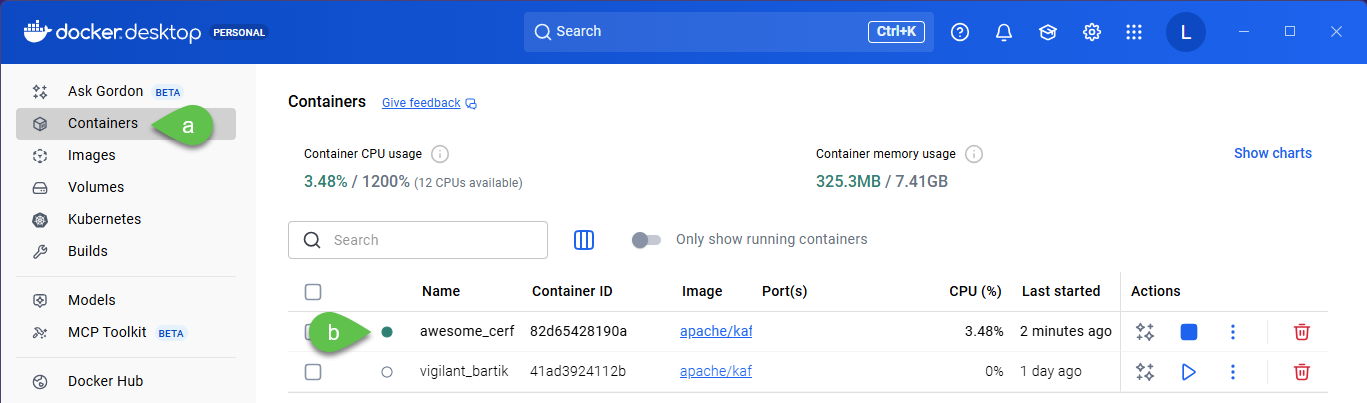 11. Open docker desktop, go to Containers, ensure the image created in part **Pre-requisites: Recommended** has been started indicated by a green dot beside it. If not, click on the **Start** button (play icon). In this example, the image name is awesome\_cerf. You will have a randomized image name