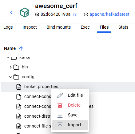 14. Staying in the **Files** section of your container, navigate to opt > kafka > config, right click on *any* file then click "Import"